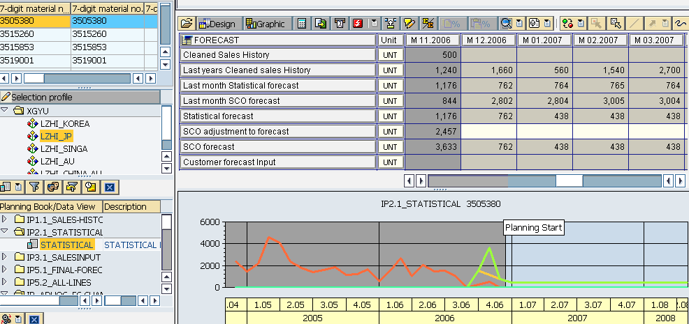 SAP的统计预测界面如图3-2统计预测,计划员可以选择不同的统计预测模型,此处选择的是AVERAGE SHORT模式,就是过去4个月的平均值。