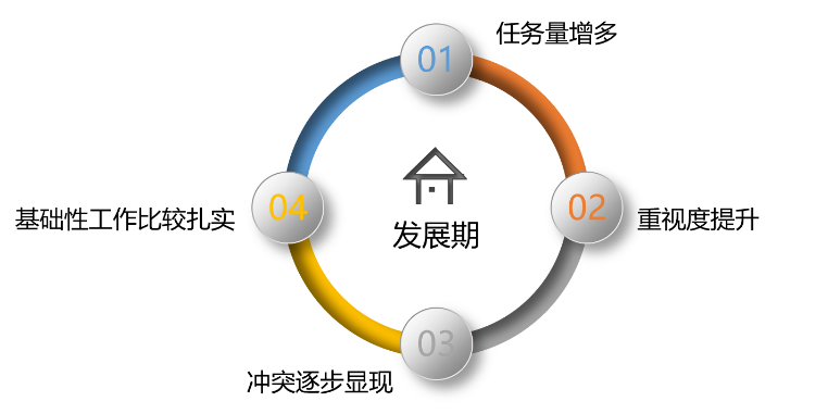 步入发展期,企业的组织发展工作会在任务量增加的同时,在忙乱的实践中不断走向正规化。这时候,企业领导及人力资源部门开始关注组织设计、组织制度、组织能力优化及人才盘点、人才发展等工作,组织发展的基础工作也会在实践中逐步扎实。
