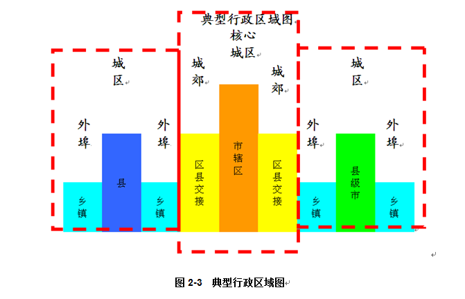 ② 一个地级市以上的行政区域,由一个地级市或核心城市与几个县(或县级市)组成,地级市可划分为城市城区与城郊,县(或县级市)可划分为县城城区与外埠区域。