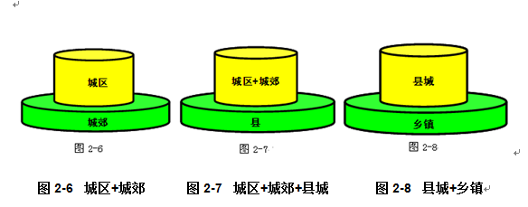 (1)城市区域细分有以下三种情况:城区+城郊、城区+城郊+县城、县城+乡镇,如图2-6、图2-7、图2-8所示。