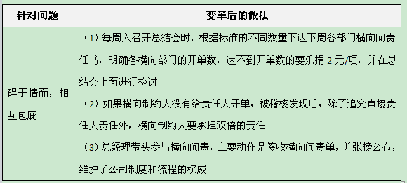 :对。第三,总经理带头参与横向问责,主动签收横向问责单,并张榜公布,维护了公司制度和流程的权威。