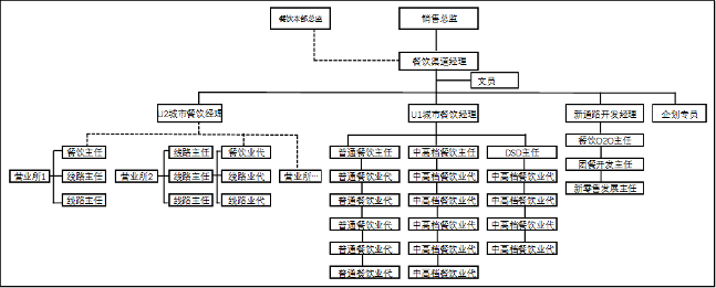 餐饮渠道的发展是随着餐饮行业的发展而变化,随着餐饮行业连锁化、规模化、中央厨房的推进,连锁餐饮快速发展,对餐饮组织能力的提升提出了更大的挑战。餐饮业代、主任需要专业的技能,更好地服务餐饮客户;餐饮经理需要协调好内外部资源,强化餐饮客户的合作。与此同时,更多的直营客户将纳入客户管理系统,餐饮业代、主任的回款将成为他们KPI考核的一部分。U1餐饮发展规模化和连锁化后,发展空间有限,U2和C类城市化进程加快,餐饮呈蓬勃发展态势,一些全国、区域、地方连锁餐饮企业纷纷下沉至三四线城市,需要有专职的餐饮团队开发和维护餐饮客户。因应客户发展的变化,餐饮组织架构也发生相应的变化,如图13-2所示。