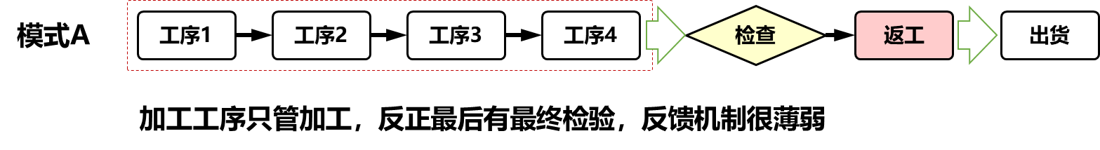 出色的质量管理与故障防止再发和高效率质量检验相关。在后工序发现了不合格品的话,直接修理并非上乘之选。首先应该尽快的与前工序进行联络。建立工序的作业标准,管理者对作业标准和员工的操作进行日常的持续确认,是企业质量管理水平的体现。收到消息的前工序应该立刻中止作业,马上投入对于问题原因的追查中,并制定实施对策。