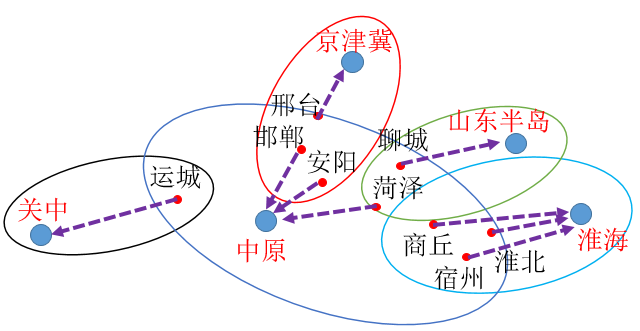 从城市群经济联系强度图可以看出,中原城市群和长江中游及山东半岛城市群联系最为密切,其次与淮海、京津冀、。长三角及关中城市群联系较为密切。
