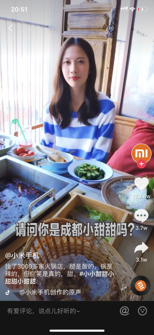 成都小甜甜靠一句“请我吃饭就好”火遍全国,没过多久,就接到了小米的代言广告,为小米拍摄了手机宣传视频。该视频点赞数超过128 万,评论 3.7 万条,至少 3000 万以上的人看到过这个视频,传播效果抵得上千万元的央视广告。