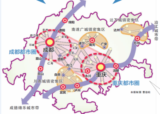 成渝城市群构建“一轴两带、双核三区”的空间格局。重点建设成渝发展主轴、沿长江和成德绵乐城市带,促进川南、南遂广、达万城镇密集区加快发展。