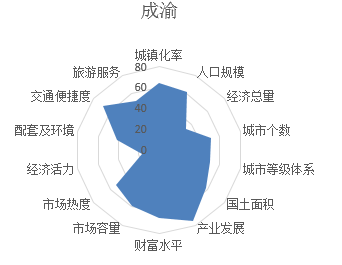 从城市群投资潜力雷达图可以看出,成渝城市群是国内较具有发展潜力的城市群,除了经济维度控制较好外,其余12个维度发展较为均衡。