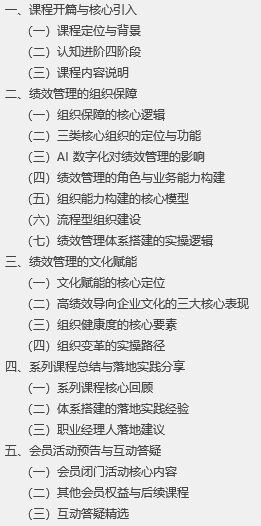 本次课程重点讲解组织保障与文化赋能两大核心模块,原定的人力资源业务领域流程架构、部门流程设计方案与模板等带教工具,将调整至本周五的会员闭门活动中详细拆解,会员可在活动中获得实操训练与答疑指导。