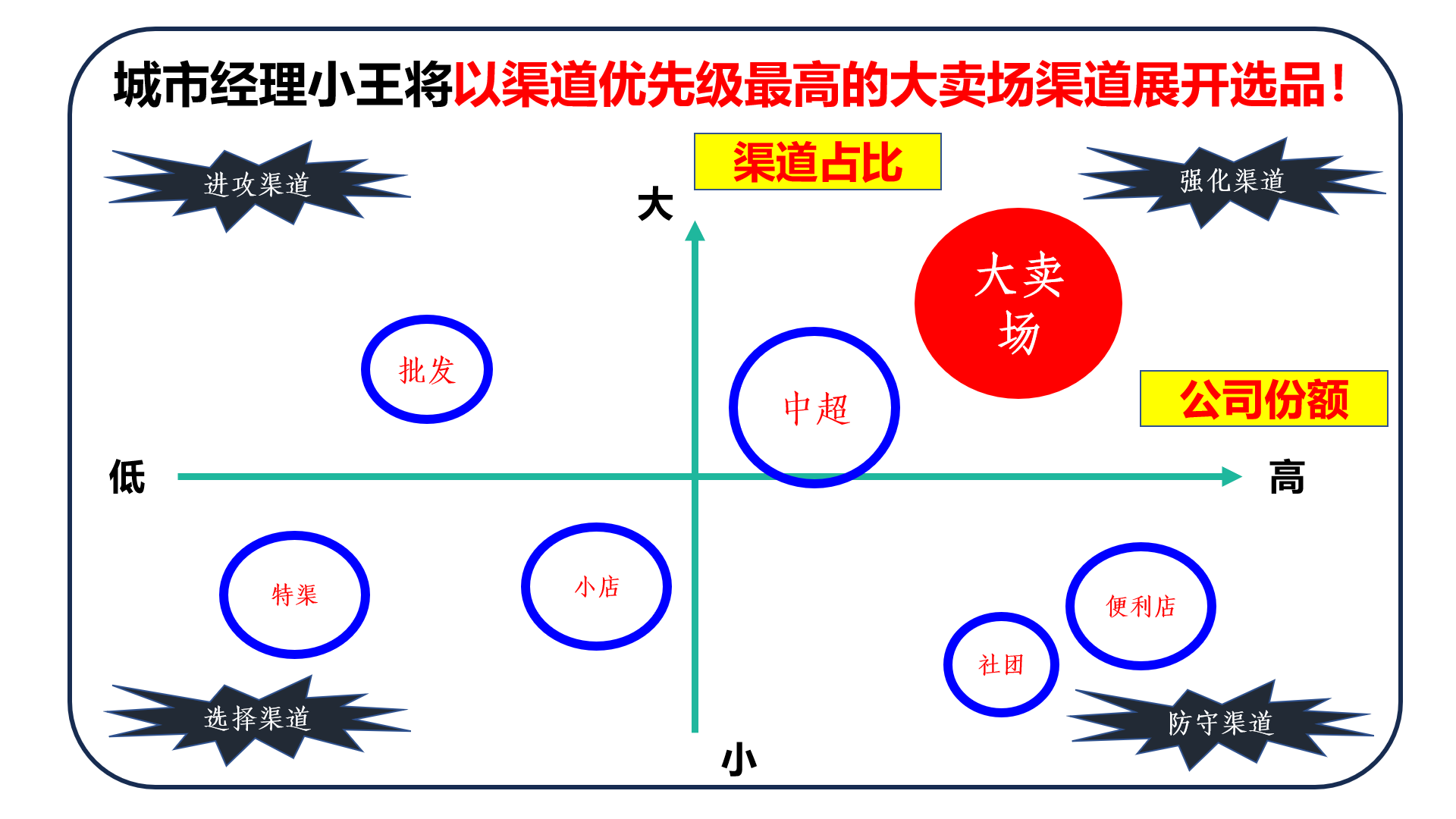 “谢谢王总,这张图一目了然,非常清晰地呈现了当地销售团队在大卖场渠道下一步的产品策略方向。原来做销售工作不仅仅是执行那么简单,还要在执行前做很多功课,仅一个选择产品组合就有这么多学问和工具。”