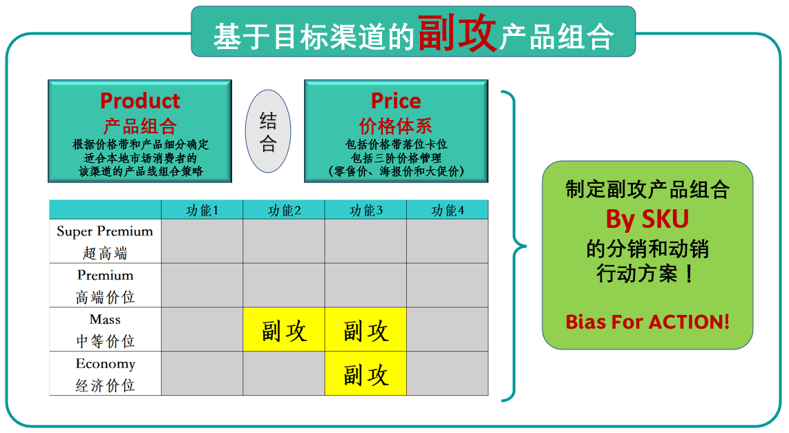 “副攻”战术类型:同上,依然是依照品类细分的价格带和功效带来匹配对应的产品组合。这个产品组合往往挑选公司畅销品的不同规格和价格带延展,同时挑选部分“梯队爆品”产品放进来。作为“主攻”战术的第二攻击产品线,“副攻”产品组合对日常渠道竞争是一个强有力的补充。