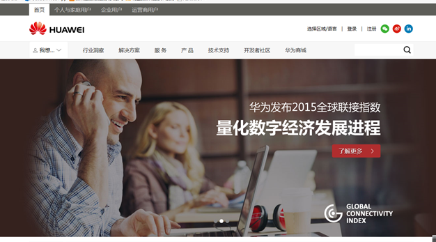 华为网站的策划、设计都很成功,板式大气,一个官网包含三个主网栏目,有个人与家庭用户、企业用户、运营商用户,每个主网下面又包含不同的栏目,内容丰富,但却搜索便捷,链接非常清晰。每个主网页图片的选择都突出了华为的核心价值理念或者产品的核心技术。