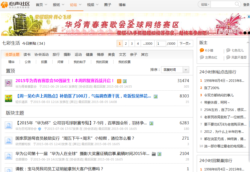 “心声社区”论坛定位为华为人的沟通家园,有98%的在职员工都是注册会员。栏目精彩纷呈,内容涉及面非常广,有论坛、圈子、博客、政策、热点、管理、兴趣等栏目,论坛下又设华为家事、七彩生活、一路同行、行政大家谈等子栏目。同时,还开通了心声微信、华为内刊APP等微媒体,更加方便信息的广泛传播。栏目中的话题杂陈,但都充满着正能量。如“心声社区”正在给《下一个倒下的会不会是华为》征集封面,这实际上是华为向全球员工灌输危机意识的一种方式。危机是华为管理中不断热炒的话题,看到这个页面,让人不由得想起任正非曾经写过的一篇在IT业界流传的文章《华为的冬天》,许多公司的老总都向下属推荐阅读,联想集团总裁杨元庆就是该文的积极推荐者。另一个论坛页面,展现的是员工们丰富多彩的业余生活,娱乐和家庭生活也是工作的一部分,这是新时期的企业文化管理者必须拥有的一种思维方法。