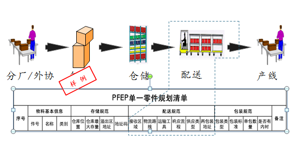 物流运作流程包含从入厂的时间窗口设计、检验流程、入库流程、库存储位设计、拣货流程、配送上线多个流程,涉及采购、计划、仓库、质量IQC、车间、供应商,这项工作必须在PFEP上,针对每类物料分别制定。如表1-5所示。