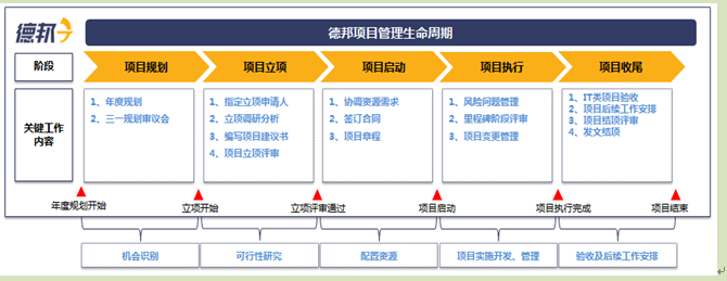 由德邦项目生命周期可见,耗时最长的项目执行只是五个阶段中的一个,而项目执行前就占了三个阶段,分别是项目规划、项目立项和项目启动。很多人搞不清楚这三者之间的联系,甚至有可能会将这三者混到一起,“不就是搞项目嘛,觉得该做了,把人叫过来直接开始做就行了,要快”类似的观点就是犯了这样的错误。