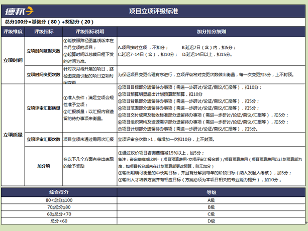 考虑像集中接送货这样的咨询案例,德邦一直在思考应该怎样最大限度地量化项目开展前准备工作的效果,重点就是将项目立项的实际效果量化。为此,德邦选择从立项时间和立项质量两个角度,对从立项调研到立项评审的全立项过程进行了量化评分。所有标准均实行一票否决,未合规,不予立项,以对项目发起部门起到引导作用。