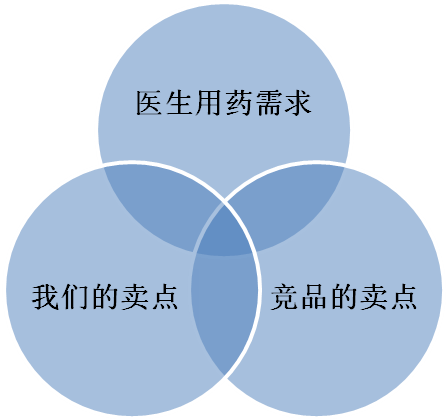 当区域确定出竞品后(1~3个),要用表格的形式罗列出该科室医生的用药需求、我们产品的卖点、竞品的卖点,然后做一个汇总分析,如图3-4所示。首先,提炼出我们卖点与医生用药需求重叠的部分,进行重点定位宣传;其次,要关注我们和竞品共有的能满足医生需求的卖点,思考如何打造差异化的要素;最后,针对我们有的,但没有满足医生的用药需求的卖点,要思考怎么创造新的需求可能性。