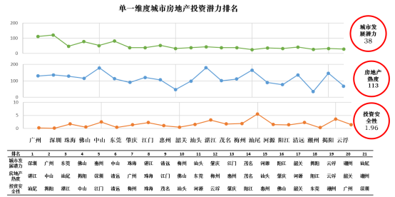 我们从城市发展潜力、房地产市场热度、投资安全性三个单一维度给出城市群各城市排名情况如下图: