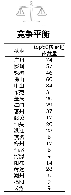 充分考虑TOP50房企之间的竞争平衡,广州、深圳、珠海、佛山、中山、东莞已进驻TOP50房企均超过30个,应重点关注市场竞争带来的非理性拿地风险。
