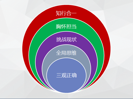核心的第一环叫“三观正确”。“三观”就是我们经常讲的“世界观、人生观和价值观”。世界观是人对整个世界的根本看法和认识。人生观是对人生的目的和意义的根本看法和态度。关于人生观,笔者比较推崇史蒂芬·柯维的《高效能人士的七个习惯》,他强调“平衡人生的成功”,认为人的一生在“健康、事业、财富、学习、信仰、休闲娱乐、爱情婚姻、家庭”等各个方面都有目标,并一生能“以终为始”地去努力实现,是一种积极的人生观。
