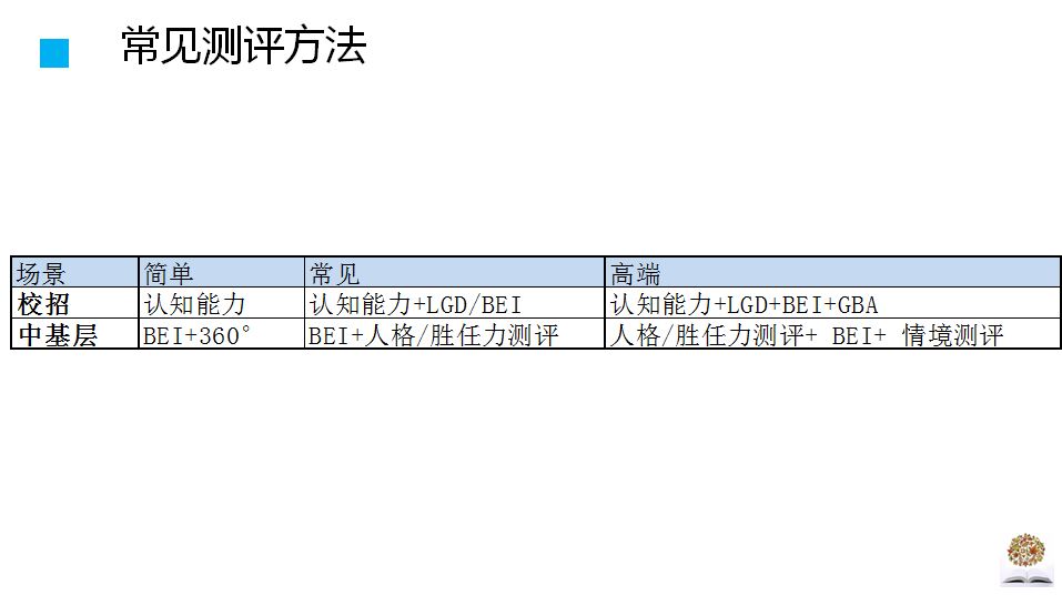 如表9-7,把校招和中基层的测评方法合并在了一起。越是简单、面向基层岗位的测评,越是强调知识、技能部分,越是高端、面向中高层的测评,越是重视胜任力。到底用哪种测评组合,取决于企业招聘筛选的对象、预算和场景。