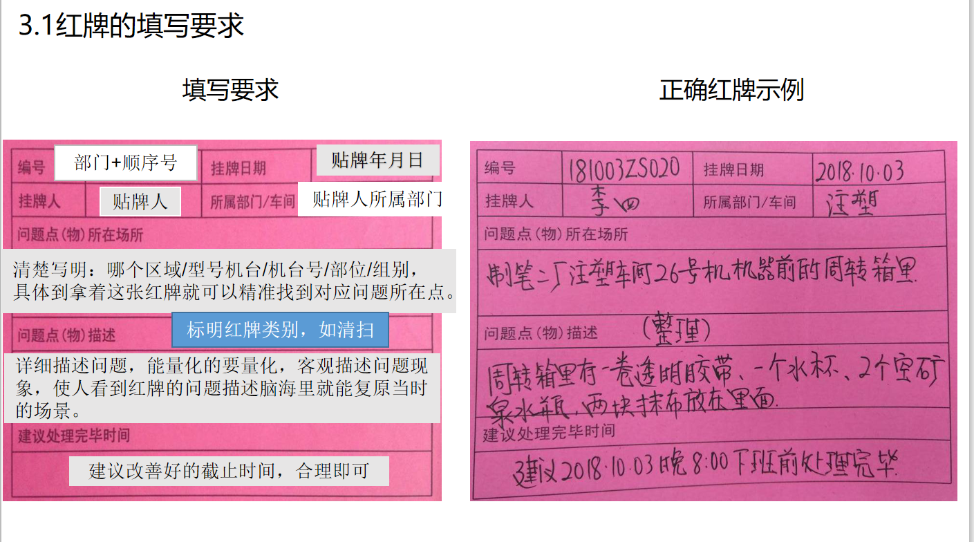 红牌作战是一个主动发现问题的工具,通过红牌作战活动让全员参与5S活动中来,去触摸现场物品、设备、工具,提升全员现场问题的意识。在刚开始推行红牌作战的时候,一定要将红牌贴的方式、红牌填写的要求和员工讲解清楚,让员工能够清楚的认识贴红牌能够提升大家的问题意识,当员工能够主动发现问题、解决问题的时候,红牌作战意味着初步成功了。