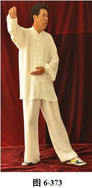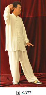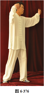 接上式,腰上提向左旋转,身体随向左转动,眼神随之向左看。挤式不变,随身向左转至正南,向上方穿掌, 右脚随之内转, 脚尖朝向南; 腰微拱,穿掌的两臂顺势向下採,重心落于右腿,呈微倚式; 腰向右外旋转, 身体稍侧向西北, 两臂随之翻转向右后,两掌指尖斜指向地面,掌心朝下。左掌落置右肋旁,右臂舒伸直落置右胯后侧;左腰上提,左脚外开,脚尖转向正南,与左肩平行;右腰上提,带动两臂平弧向正南,成左弓步;腰向左拱撑,两臂向左下划大平弧,重心移至右腿;两臂继续向下划弧,随重心转移后倚收回腹前,呈两掌相对微合在一起(见图6-367至6-377)。腰微拱旋转向右,身体带右肘随之微转向稍西北,打出右边肘;腰回转微含,随之上提,右臂顺势向右外斜上方平送打开, 右掌变勾手,略高于肩。左手仍置腹前;左腰微拱向左外转,提左膝, 左脚向左前上方迈出一大步,身体转向正东。左腰继续上提,左臂随之向前掤出。右脚随身内转,脚尖朝向东南,呈大左弓步;腰微拱,身体稍后倚,将左掤出的手掌顺势向内旋翻,掌心向下採按至腹前。腰随即上提,左掌随向左前上方掤推。
