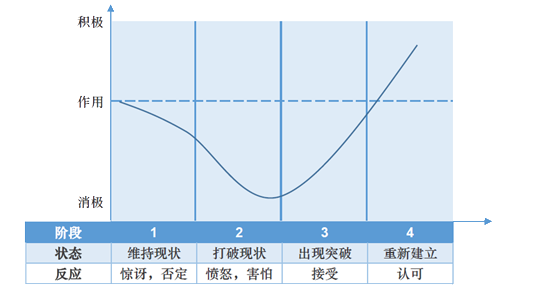 在变革开始实施后的第二阶段,人们会以一些消极的方式来回应。比如对变革可能对自身带来的损失感到焦虑或愤怒,对变革方案进行抵制等。如果人们拒绝变革进程,持续停留在第二阶段,将会对变革造成极大的阻碍。