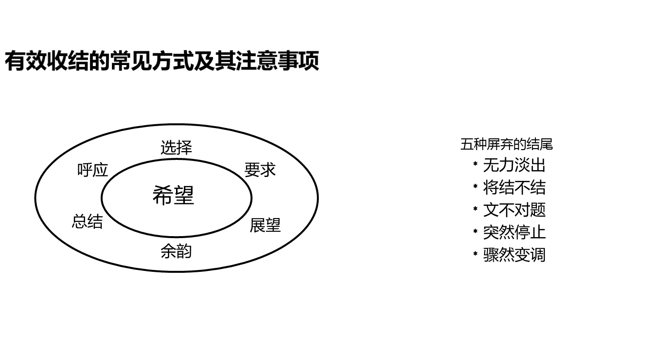 接下来,再来看看整堂课程的结束。首先需要摒弃的几种结尾方式,分别为无力淡出、将结不结、文不对题、突然停止和骤然变调。