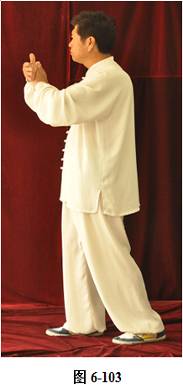接上式,腰微拱,重心渐渐移至左腿,右手随重心转移向左下腹划弧捋至左肋旁。手心翻转向上,左手随腰拱,向外上方划弧翻转掌心向下,高与肩平,成左抱球状。右腰上提,右脚随即向前迈出小半步,右手臂上翻向前打掤(见图6-100至6-107)。