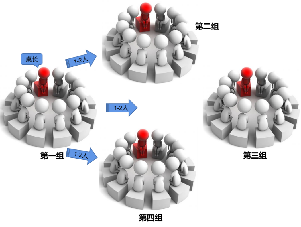 第三步,讨论结束后,选一位为“桌长”留在原地,其他人成为“旅行者或采蜜者”自由离开原位,到其他小组重新组成讨论组。