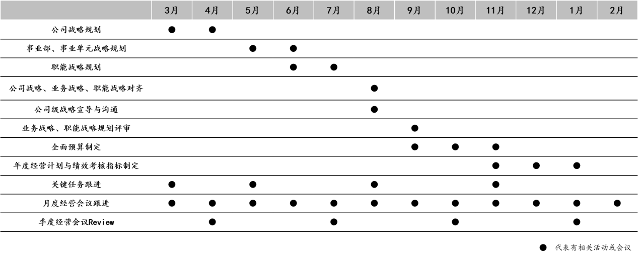 具体而言,在三大循环之一——战略规划子循环中,A公司通过建立战略日历的方式进行相关活动管理,整体说明如下: