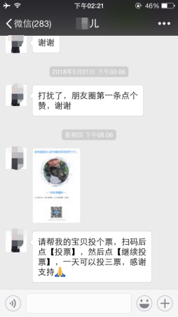 我们经常会收到这样的集赞群发信息,从聊天截图可以看到发信息者与陌生微信好友很少聊天,我连你是谁都不知道,你的问题,你的需求,你的宝贝需要投票,你的朋友圈活动需要集赞,跟我有什么关系?我帮你的理由是什么?