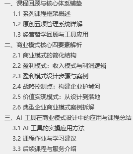 本次课程是 “从企业战略到经营计划” 系列的第二讲,主题为商业模式与发展战略。该系列共四期,第一期聚焦企业哲学,后续两期将围绕战略落地与经营计划展开。在此之前,王春强老师已带来近 15 讲企业管理体系打造课程,涵盖底层逻辑、顶层设计、组织诊断、战略系统诊断、集成供应链、激励系统等多个领域,核心依托其原创的五项管理系统方法论。