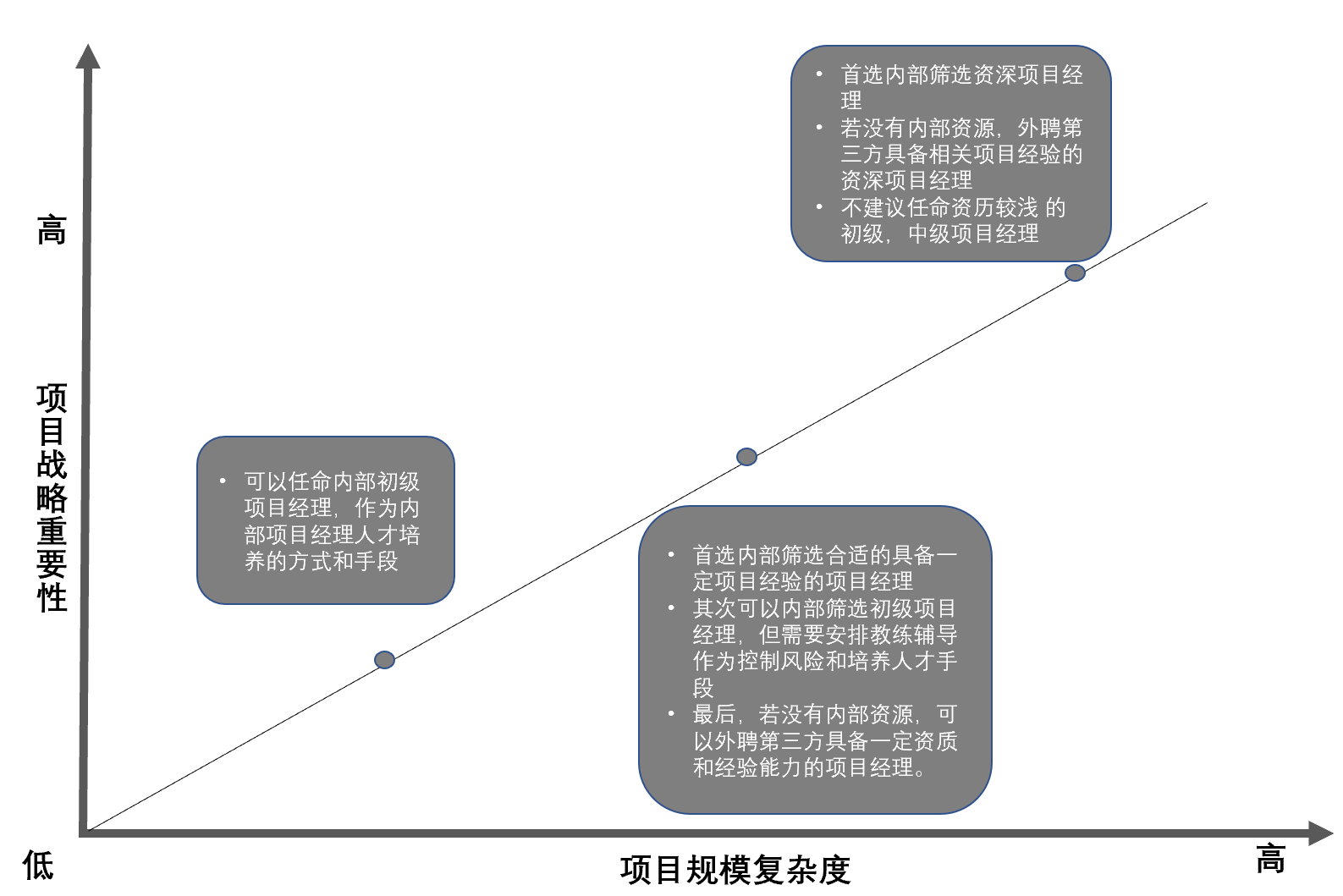 (1)如果公司设立了PMO部门或者相关的项目管理部门,通常会设有专职的项目经理,他们经过专业的培训与认证,可以根据项目的专业背景、进度和复杂度等因素去匹配合适的人选。但这些项目经理也经常是公司内部的“香饽饽”,如果我们下手太晚了,可能就错失了优秀的项目经理人选。