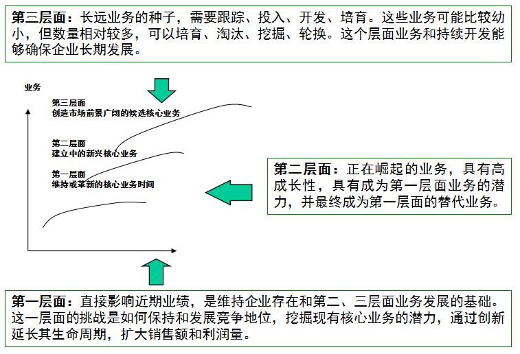 值得注意的是,这三个层面的业务并非孤立存在,而是相互依存、协同推进的。企业需同时关注并管理好这三个层面的活动,确保它们之间形成一条连续不断的更新管道。只有这样,企业才能在稳固现有业务的基础上,不断培育新的增长点,为未来发展奠定坚实基础。面对复杂多变的市场环境,企业还需保持高度的敏锐性与灵活性,及时调整战略方向与资源配置,确保三层面业务架构的持续优化与升级,从而推动企业实现持续健康增长。