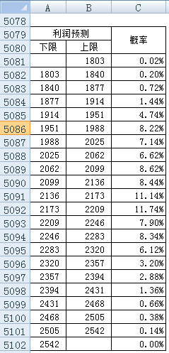 A5108:="预期利润在"&(ROUND(B5104,2))&"和"&(ROUND(B5105,2))&"之间的概率为"&(ROUND(C5105×100,2))&"%"