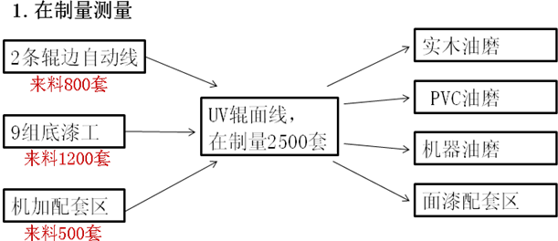 (1)一个产品大约由20块不同的板件组成,其中真正工序时间长的板件只有门板部件,涂装工序喷涂后需要待干,而且返工极多,压缩生产周期很困难。项目组转化了1个思路,将A类产品根据预估的销量,单独针对门板部件额外的设定了在制品库存3天,从而压缩了A类产品的涂装车间的交付周期时间。