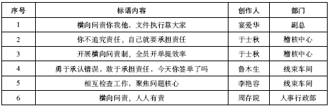 :横向问责宣传标语从一个一个员工中来,从这条责任链条里的每个人来。横向问责宣传标语如表4-5所示。