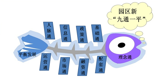 即理念通、基础通、政策通、信息通、配套通、市场通、人脉通、融资通、运营通和园区平衡发展)的理念与操作体系,推进园区的建设与运营,实现各方的互利共赢。