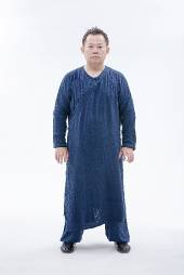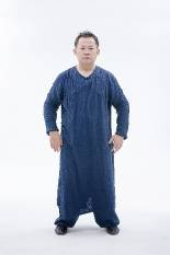 7.全身再度松沉一次,随着松沉往下的同时,双手顺势垂落。先交叉下落至丹田处,待双手指尖朝下后,手再向两旁卷开至两腿裤缝旁,掌心朝后。