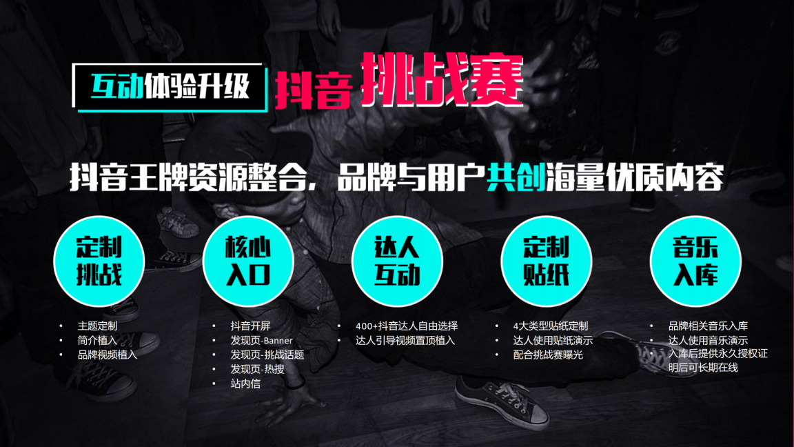 为了最大化传播品牌,抖音制定了挑战赛广告模式(图8-12)。企业可以通过发起挑战赛,通过玩法规则定制、多广告传播、多达人互动、贴纸定制等方式,让品牌和用户共创传播内容,最大化传播品牌。