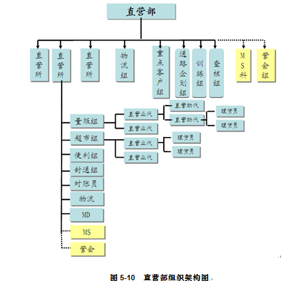 如果按通路划分营业组,那么直营所可分为量贩组、超市组、便利组与封闭通路组,并配备所MD、所MS、物流、营会与对账员。直营组一般由直营业代与直营助代组成,直营助代由直营业代管辖,部分直营业代或直营助代还管理一定数量的理货员。