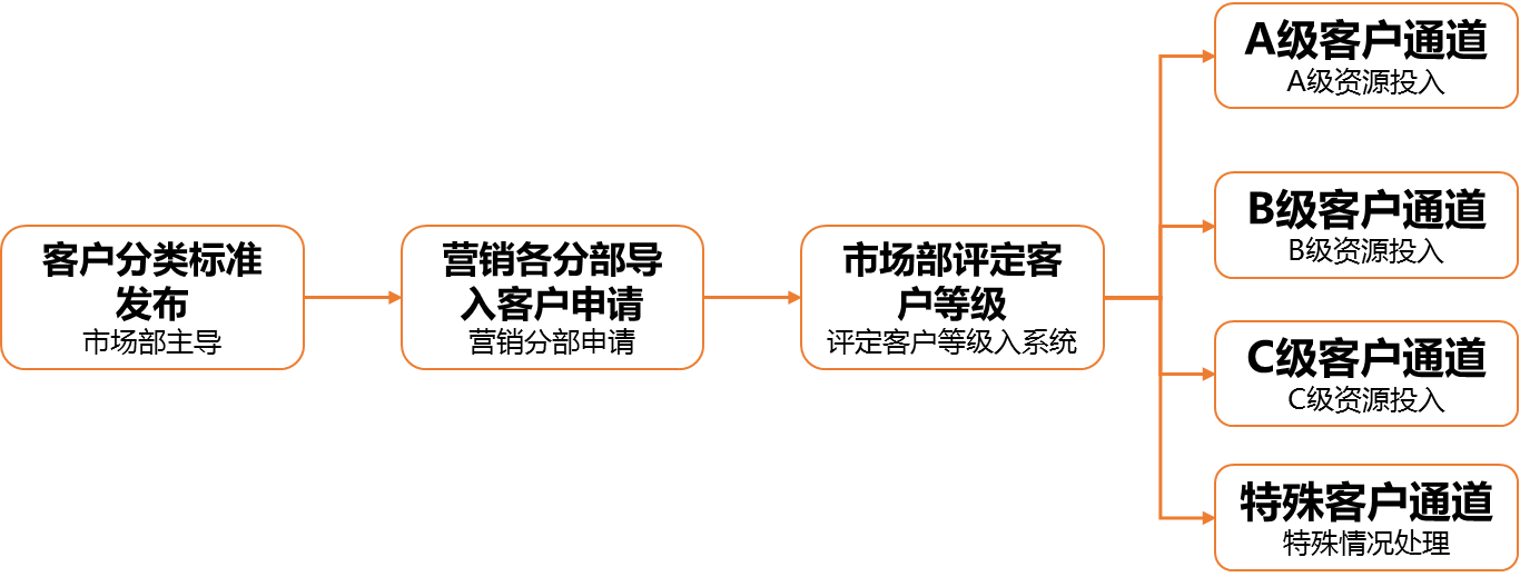 客户分级分类的子流程将在营销其他模块中体现,核心思想就是优质客户投入公司的核心资源,确保提升大客户的满意度,而对其他客户也有明确的服务标准,确保让每一个不同级别的客户都能享受到对等的客户服务。