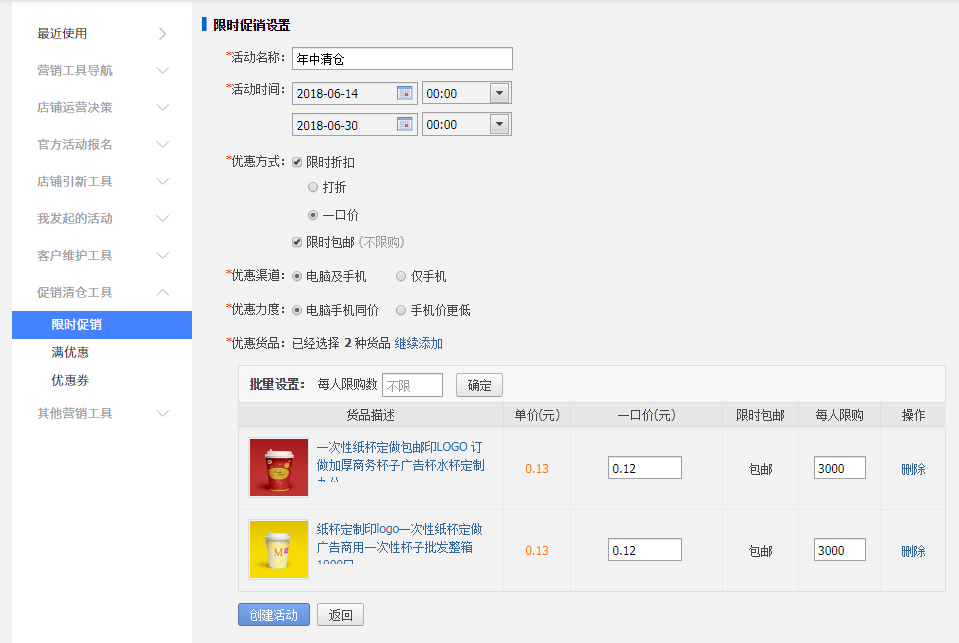 第一个站内营销工具是:限时促销,或者叫限时折扣。限时折扣是在特定的营业时间内提供优惠商品销售的措施,以达到吸引顾客的目的。可以当作老客户的回馈促销,也可以增强进店访客购买欲。限时促销的作用类似于紧迫感,在店铺中能增加客单价,加快客户下单速度,在店铺中一定要使用限时促销这个营销工具。使用这个工具的技巧: