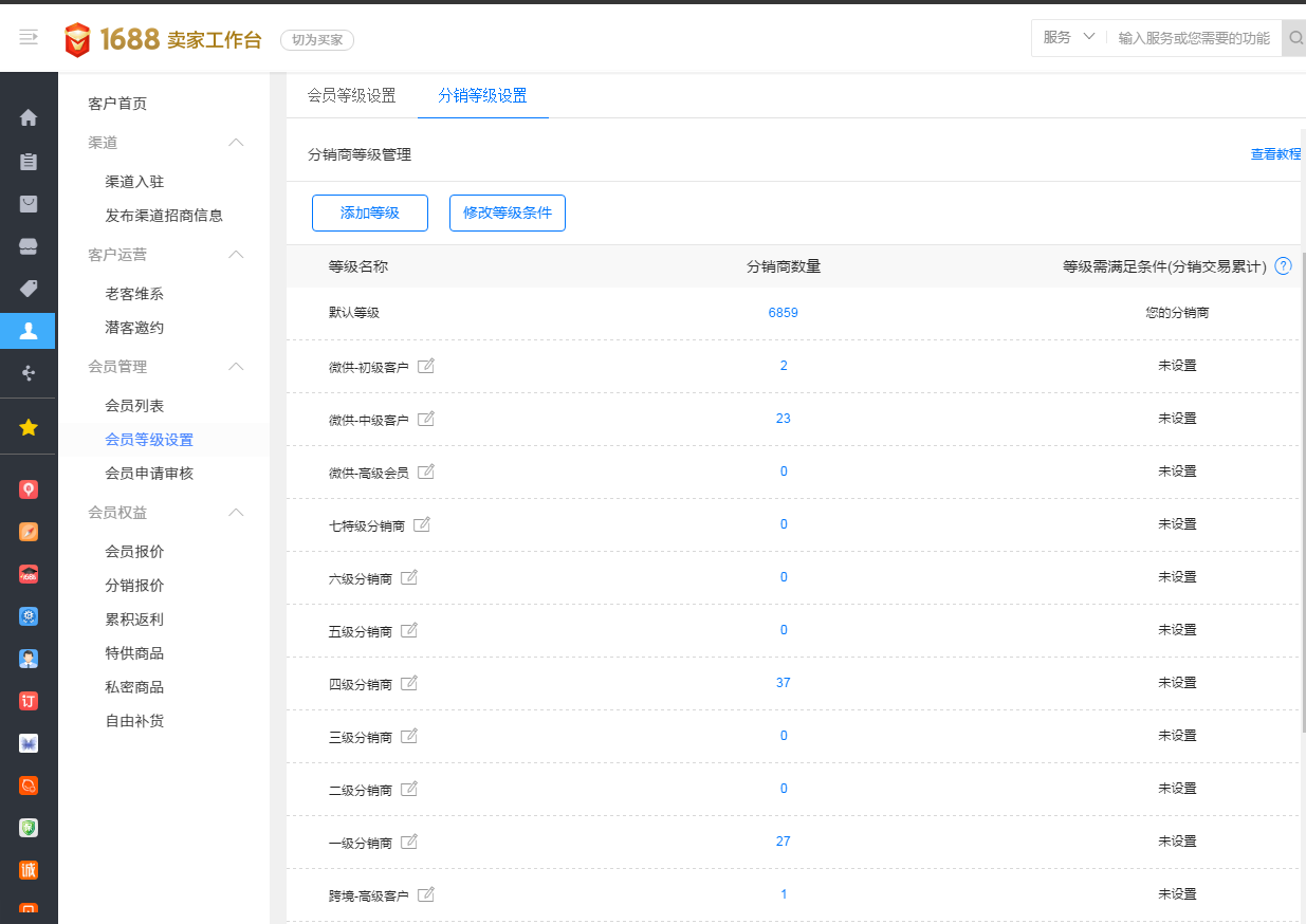 具体操作路径是:我的阿里——卖家工作台——客户——会员管理——会员等级设置。设置这个相当于设置了会员等级,也就相当于客户在店铺中消费多少则自动对应相应等级。在这里可以设置金额或者交易笔数,可以按照系统自带的等级划分,如普通会员、高级会员、VIP会员、至尊VIP。客户分层设置和等级设置类似,这个分销设置如二级分销商、三级分销商、四级分销商、五级分销商、六级分销商、七级分销商,还分为微供初级会员、微供中级会员、微供高级会员等。这里的分销等级基本上只能增加不能删除。还有一种情况,就是我们将会员等级系统做个表格或者是放到详情页中,可以用PS做。只要展示给客户,让客户对应自己的等级即可。如图9-10所示。