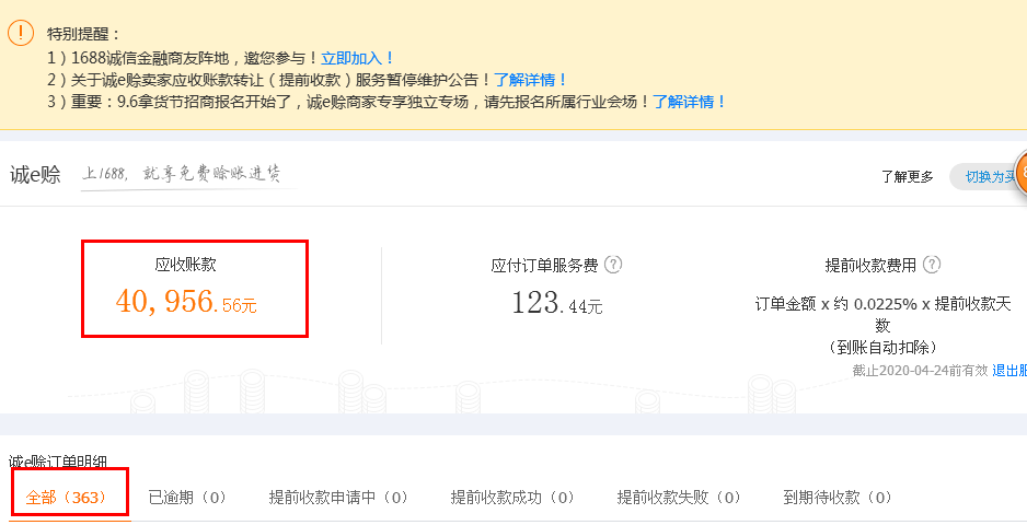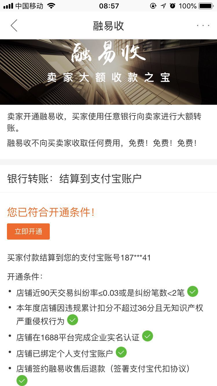 这里就不一一详细阐述了,都在后台我的阿里——交易方式——融易收、账期支付、货到付款等。这里有几个地方需要说明,第一个就是融易收,融易收建议开通,有利于大额交易,具体路径为: