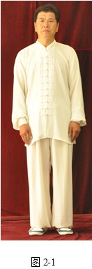 (1)意念放松:两膝微屈,与涌泉穴垂直,抬左脚平行拉开,与肩同宽,两臂自然下垂,掌心贴近股骨外侧,手中指指尖靠近风市穴。头顶正直,舌抵上腭,下额微收,两眼微闭,唇齿微合,自然呼吸。