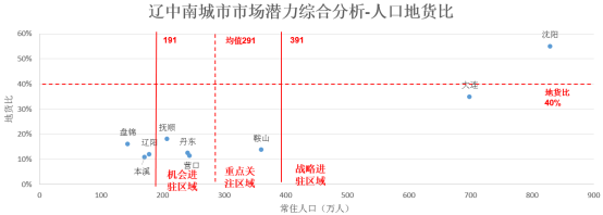 市场潜力从常住人口和地货比两个维度考虑,地货比较低且人口规模相对较大代表市场潜力较大。战略进驻区域城市共1个,分别为大连;重点关注区域城市共1个,分别为鞍山;机会进驻区域城市共3个,分别为抚顺、丹东、营口。