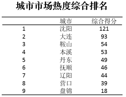 辽中南城市群城市市场热度综合排名TOP3的城市为:沈阳、大连、鞍山。