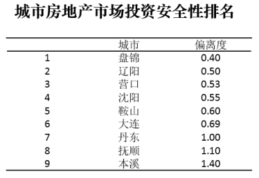 辽中南城市群城市房地产投资安全性综合排名TOP3的城市为:盘锦、辽阳、营口。偏离度大于1的城市投资风险较高,应谨慎投资,主要城市有本溪、抚顺、丹东。
